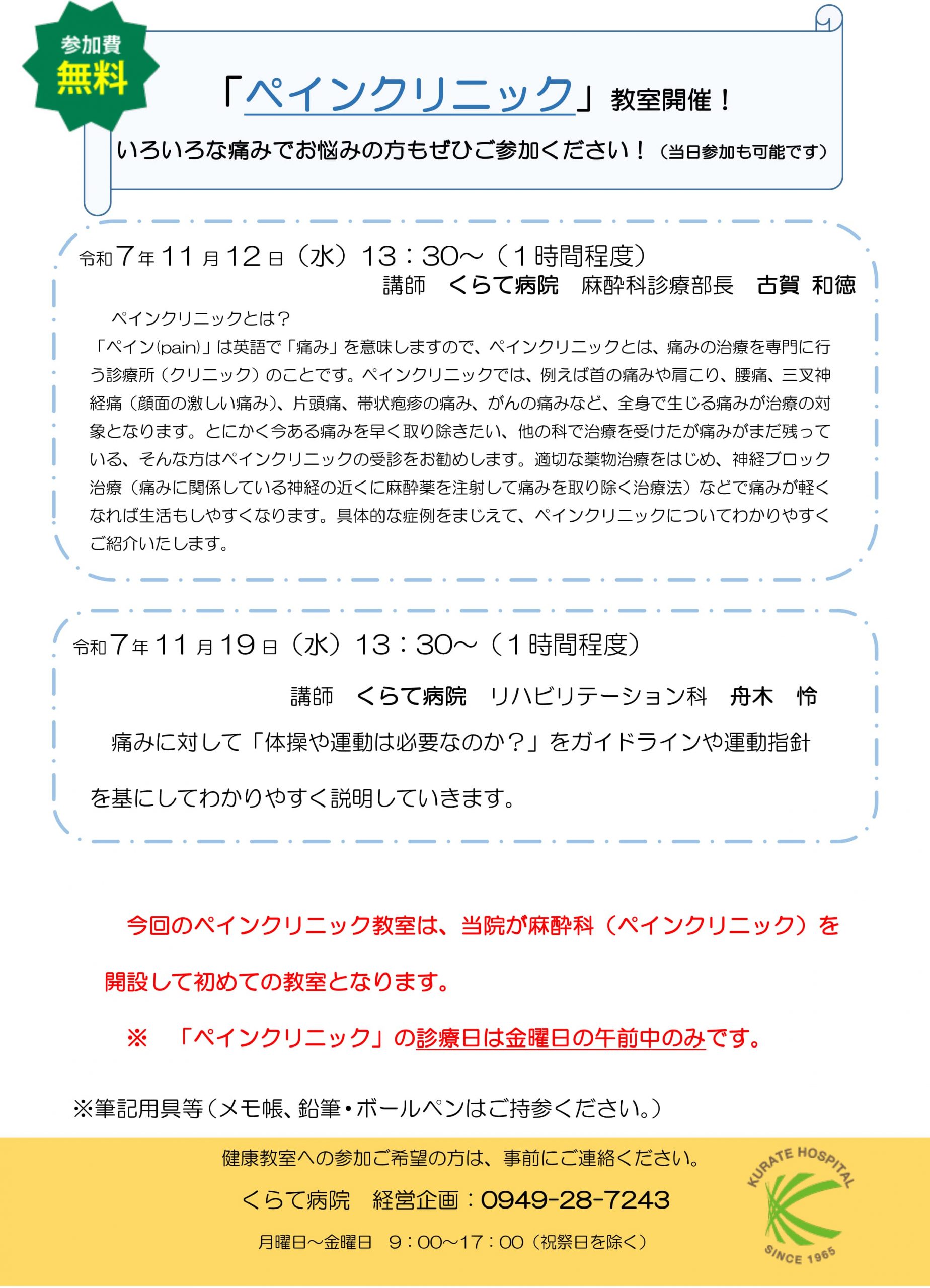 健康教室 2025年11月開催のお知らせ 2025.10.15 上記画像をクリックすると、PDF形式で詳細をご確認いただけます。 公告「地方独立行政法人くらて病院看護衣等賃貸借及び洗濯業務、入院セットレンタル業務、寝具・防水シート等賃貸借業務に係る公募型プロポーザル実施について」 前の記事 令和8年度入職 くらて病院職員採用試験のお知らせ 次の記事