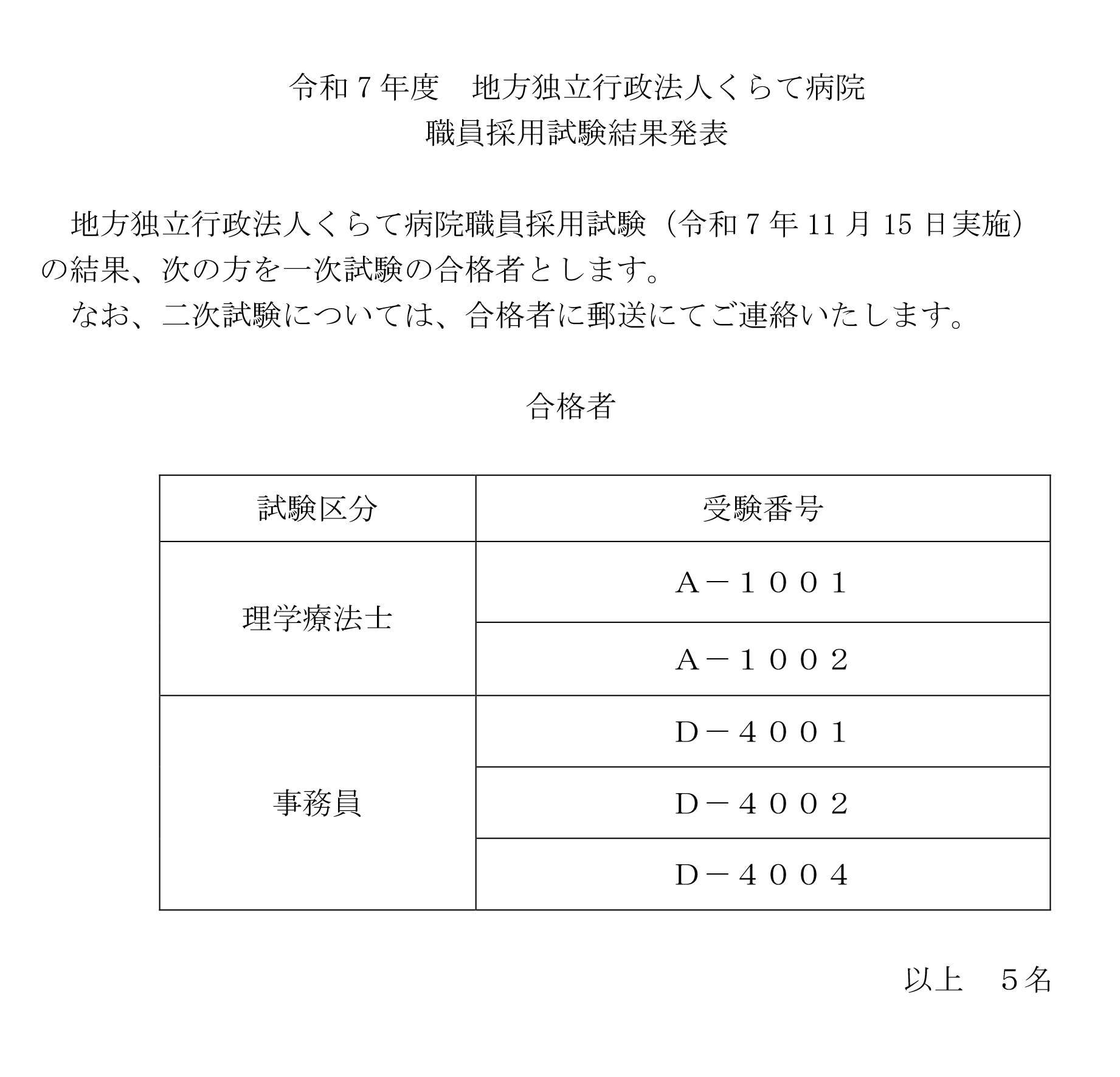 令和8年度入職 くらて病院職員採用試験 一次試験(令和7年11月15日実施)合格者発表 2025.11.27 令和8年度入職 くらて病院職員採用試験(看護師) 最終試験合格者発表 前の記事 令和8年度入職 鞍寿の里・鞍寿クリニック 職員採用試験 一次試験(令和7年11月15日実施)合格者発表 次の記事